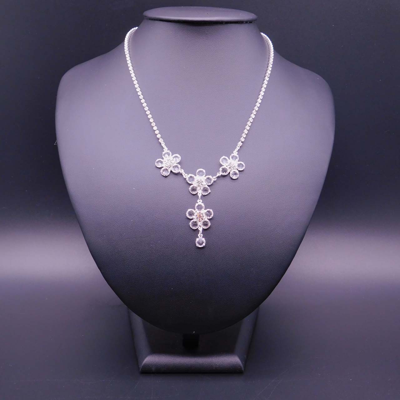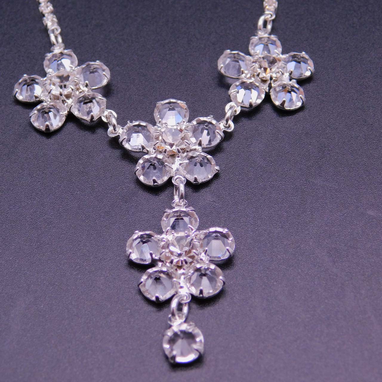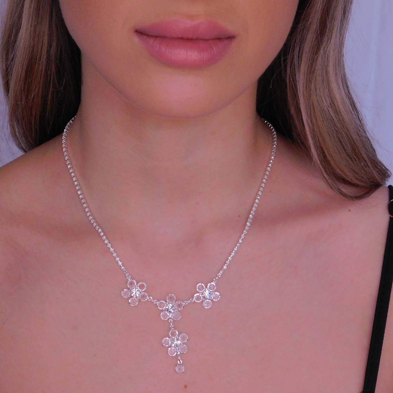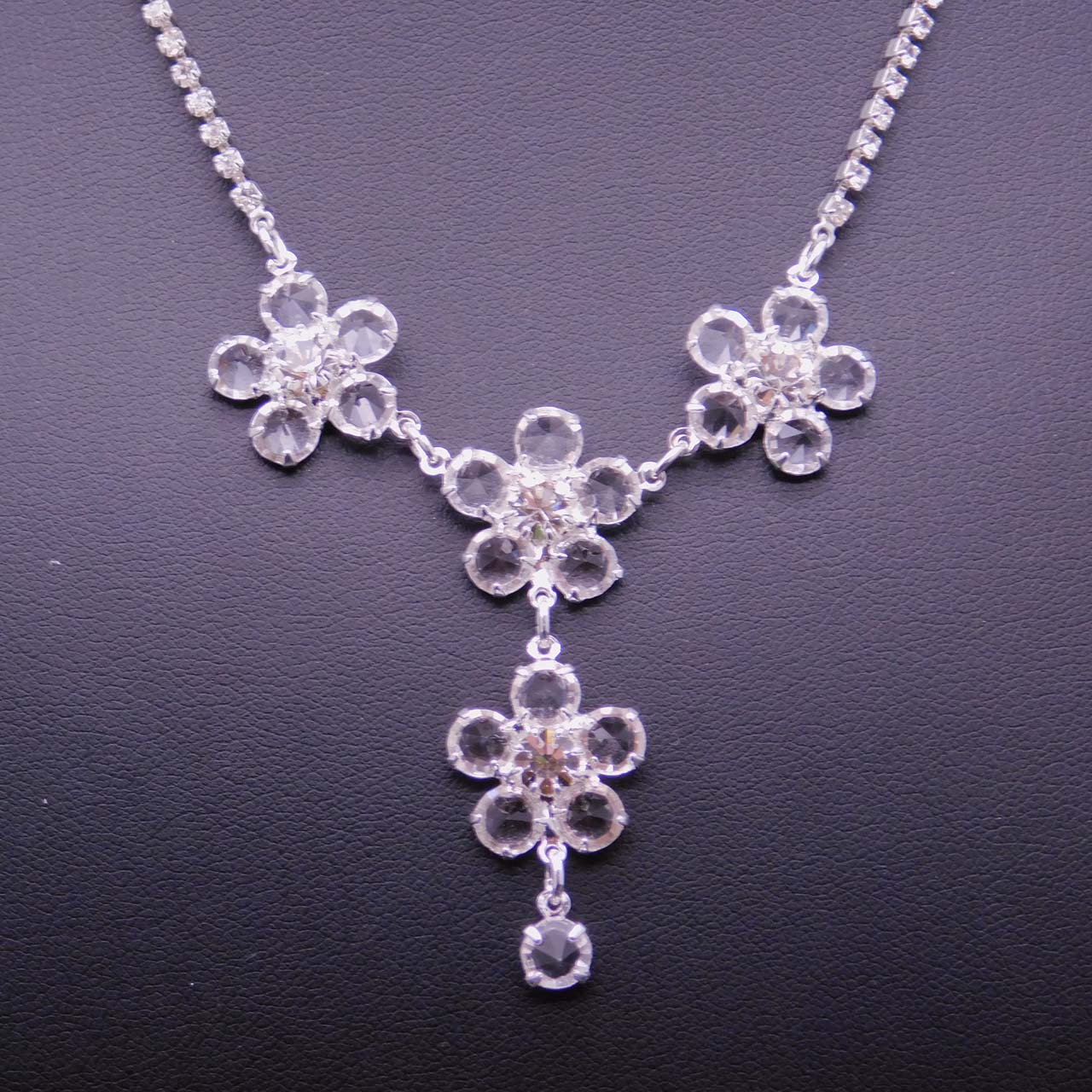 Jemný štrasový romantický náhrdelník čiré barvy s chanelovými kytičkami.