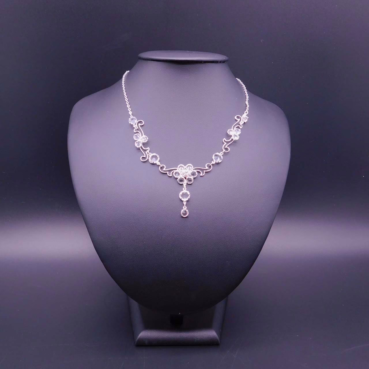 Třířadý náhrdelník vyrobený z kvalitních strojně broušených skleněných kamenů a technologií fastované borty, jedná se o tradiční ruční techniku, kdy se mezi řídkou tkaninu (stramín) vkládá z jedné strany kotlík s krapnami (úchyty pro broušený kámen) a z druhé vrchní strany šaton, který se do tkaniny následně upevní pomocí strojku. Předností této technologie je větší poddajnost a příjemnější nošení výrobku.